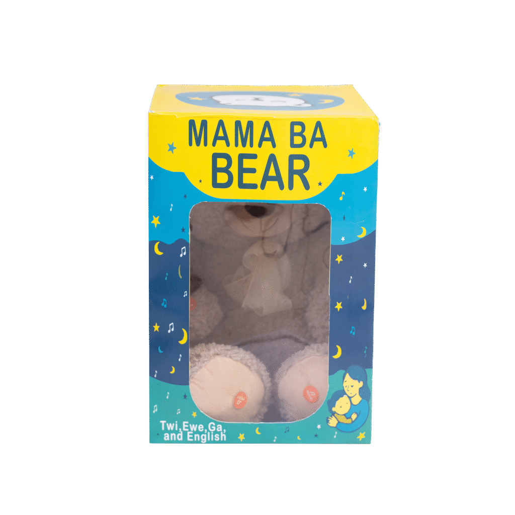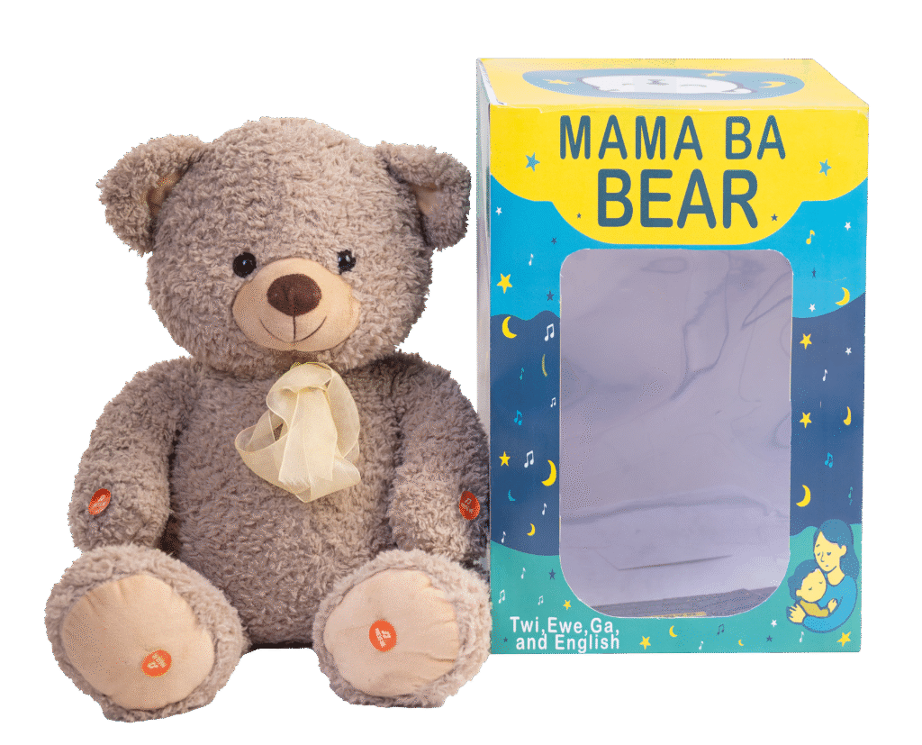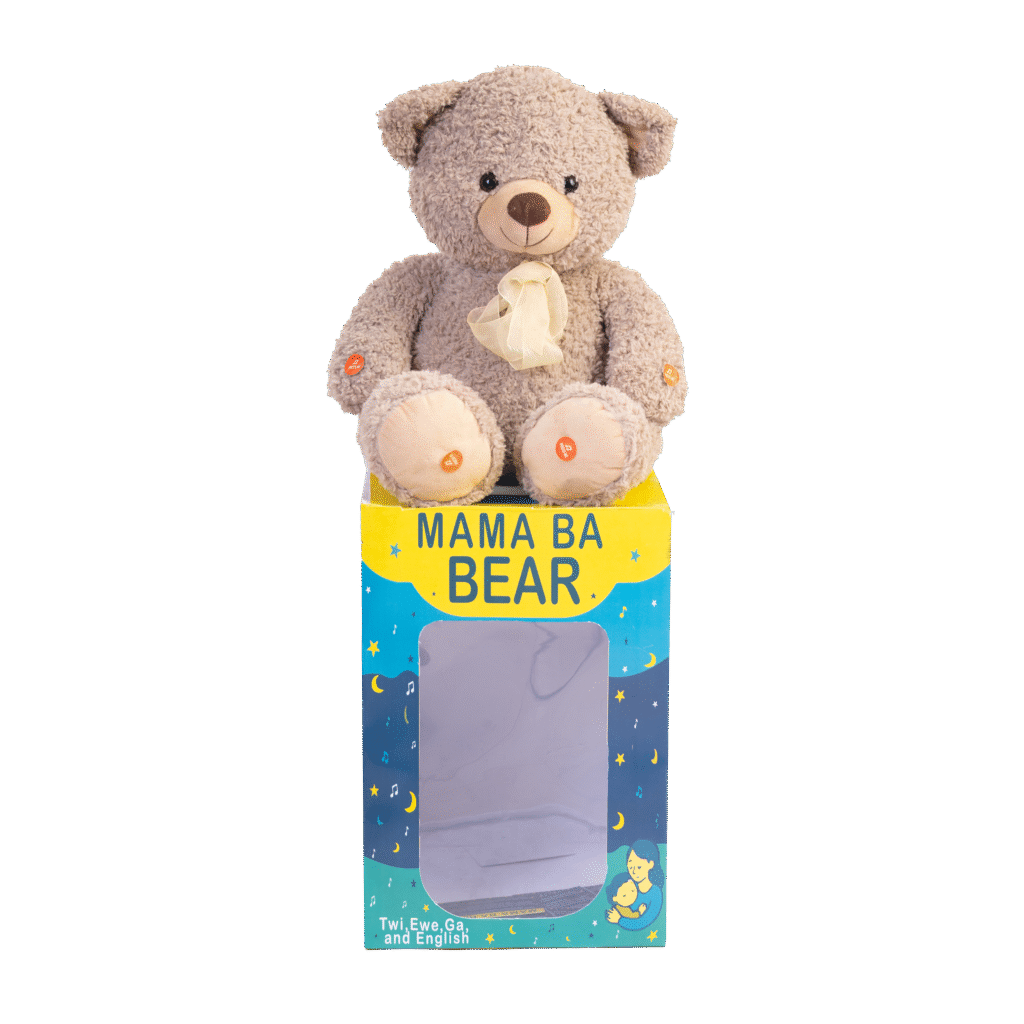 That’s why Mama Ba Bear was created. More than a teddy bear, it is a cultural companion, soft, comforting, and alive with the songs of our people. Singing lullabies in Twi, Ewe, Ga, and English, Mama Ba Bear brings home to every child, no matter where they are in the world.